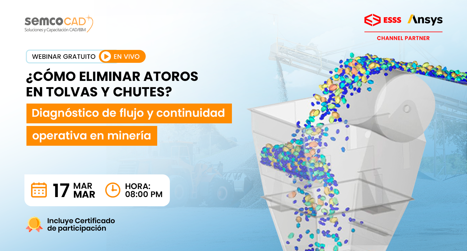 En este webinar, mostraremos cómo el software ANSYS Rocky (DEM) permite visualizar el flujo real de partículas, permitiendo identificar causas raíz de fallas críticas como arching (puentes), ratholing y segregación. Además, aprenderás a comparar alternativas A/B de diseño para mejorar la estabilidad de descarga, reducir derrames y disminuir el impacto y desgaste en los chutes de transferencia. Se incluirá una demostración en vivo con KPIs y recomendaciones accionables.